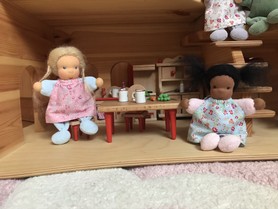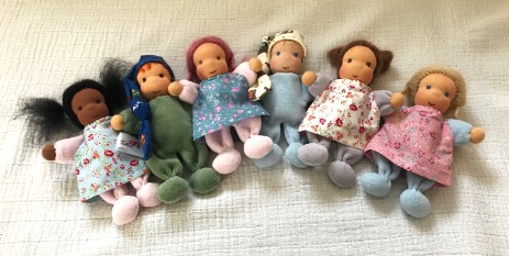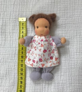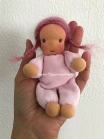 Sie sind stolze 15 cm groß , der Körper ist aus kuscheligem Baumwollnicky, und trotzdem sind sie durch die keinere Gestaltung, den Haaren und die Anziehsachen nicht mit den Zwergenschmuserle als Erstlingspuppe zu vergleichen.