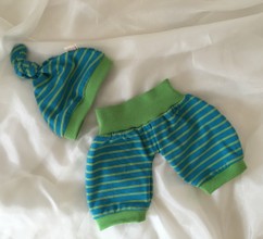 Die Arme und Beine sind mit Abnähern versehen und lassen so eine gewisse Beweglichkeit zu um dem kleinen Kind die ersten An-und Ausziehversuche zu erleichtern.